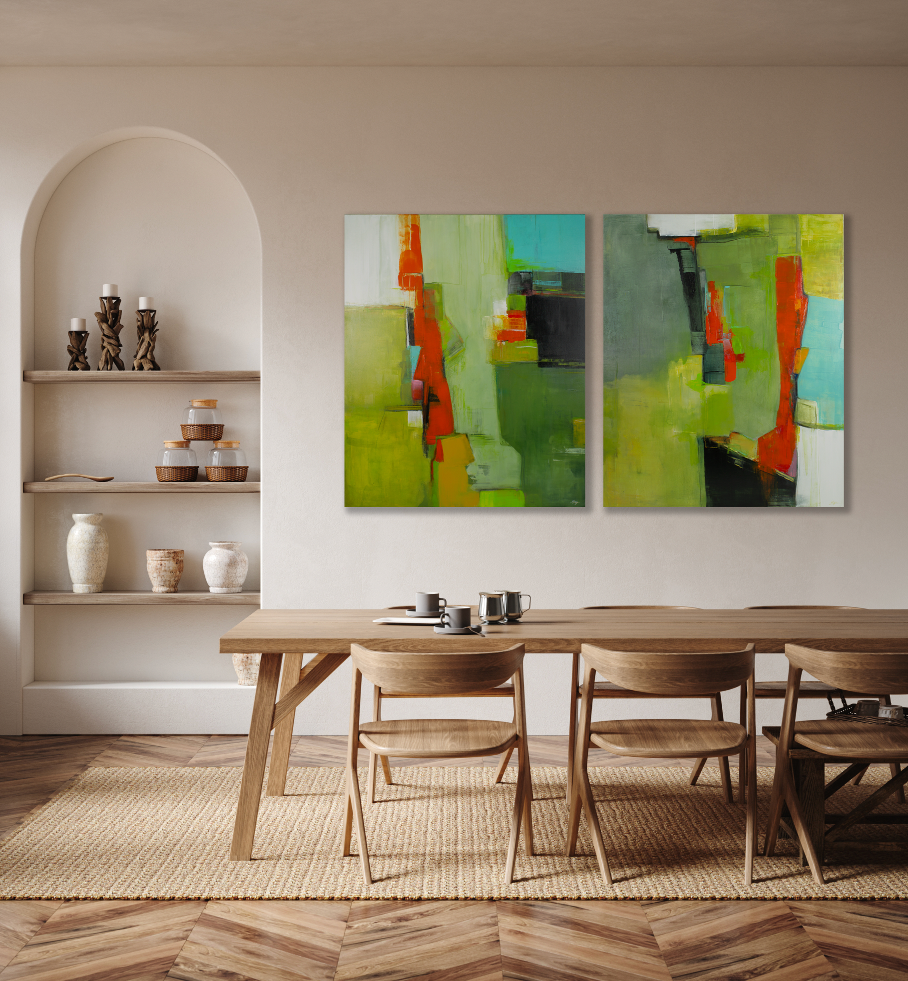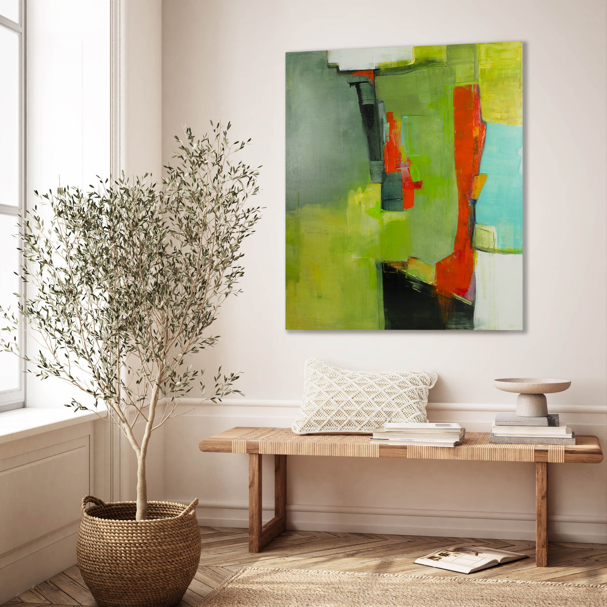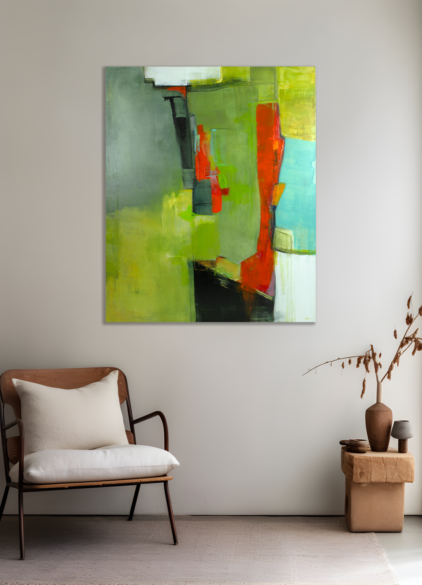 This abstract painting reflects the quiet balance of life, where nature’s greens are punctuated by bursts of red and orange, representing moments of fullness and vitality. This piece draws on the subtle rhythms of nature, where growth and change coexist in harmony, inspired by the beauty and balance found in the natural world.
