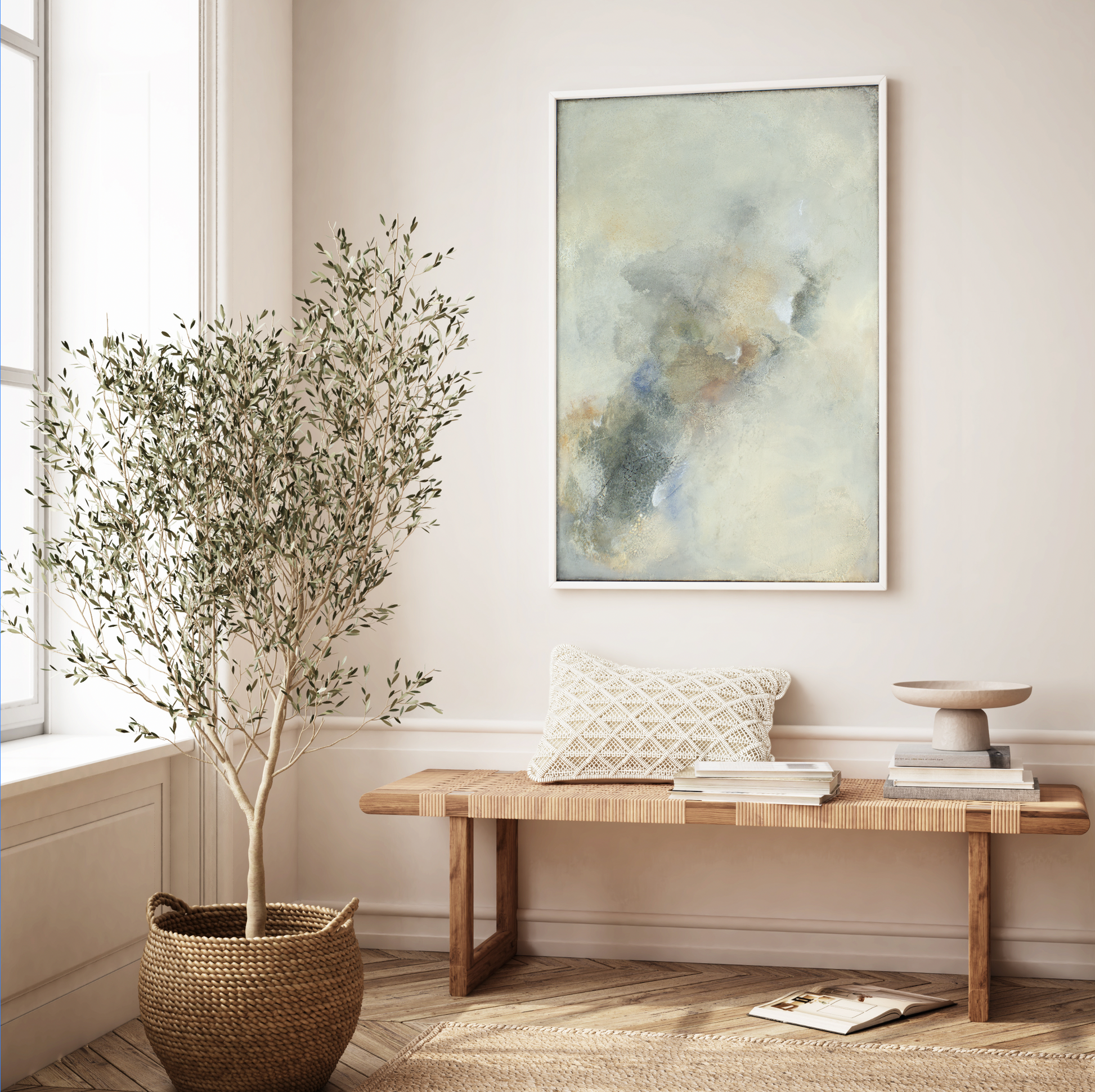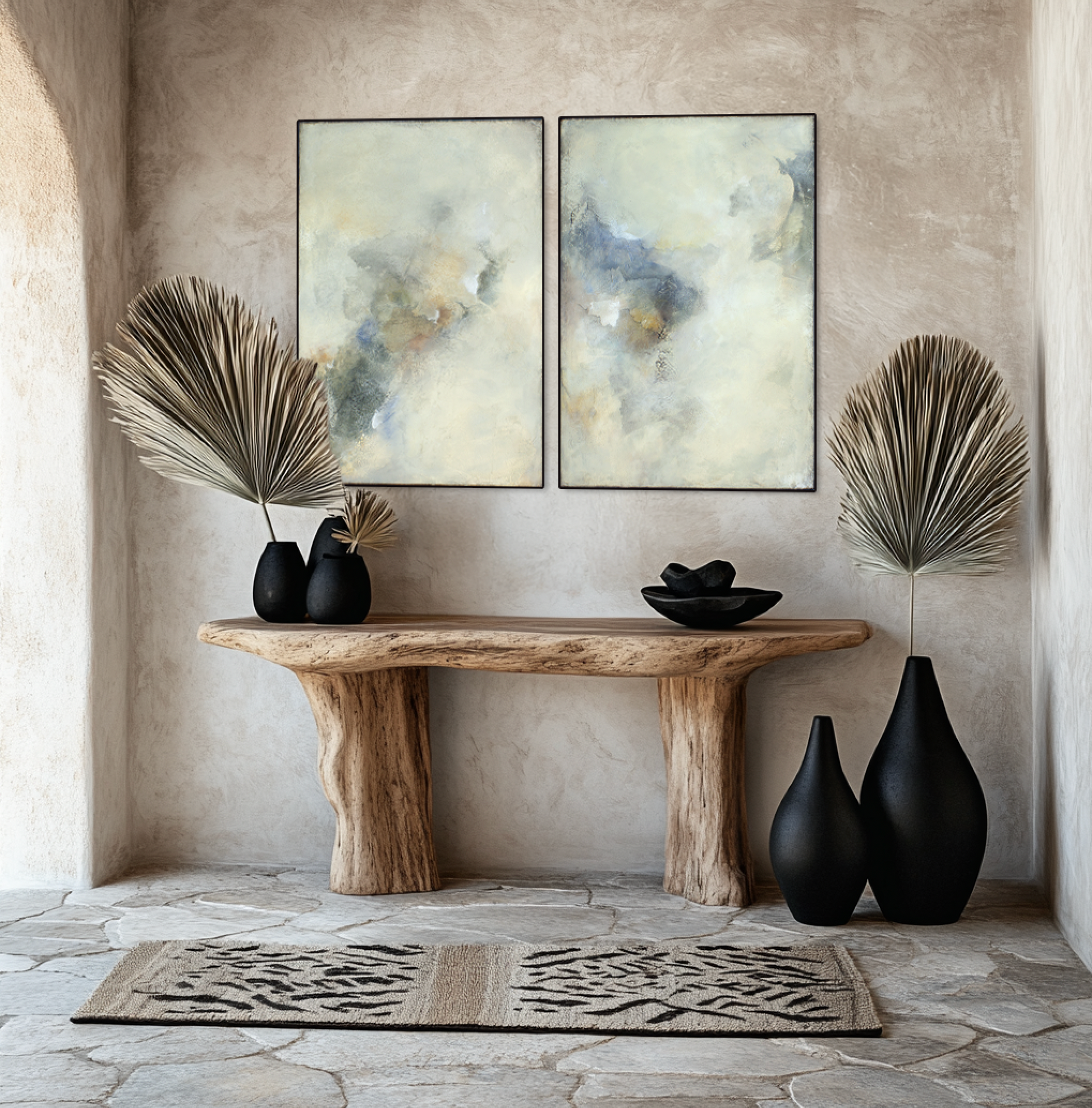 This paired series draws from the quiet beauty of stones found along Australian beaches – each hue a reflection of nature’s understated palette. Soft watercolour-like washes of purplish browns, mustard, black, and beige flow across the canvas, echoing the gentle erosion and weathered textures of sand and stone.