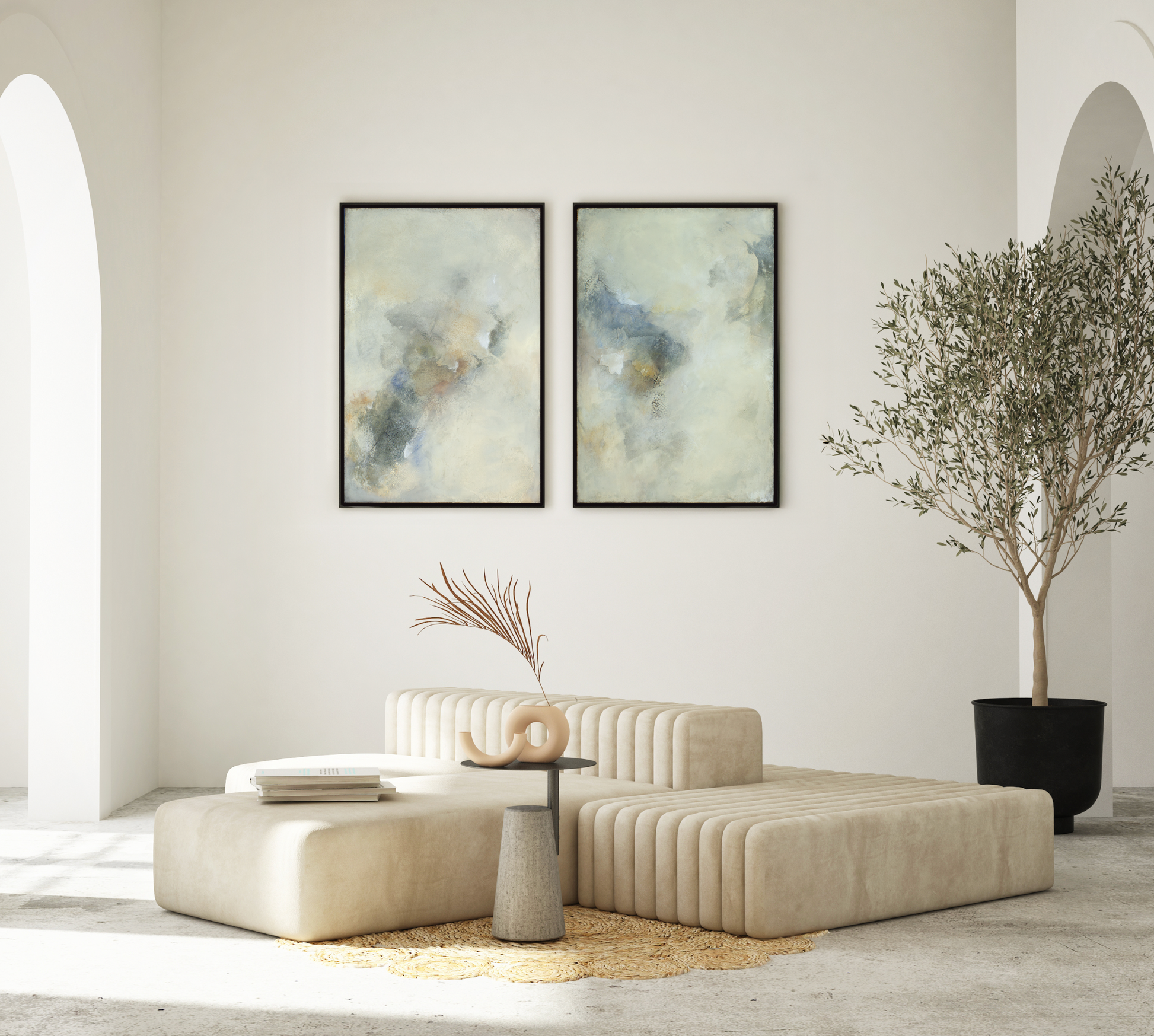 This paired series draws from the quiet beauty of stones found along Australian beaches – each hue a reflection of nature’s understated palette. Soft watercolour-like washes of purplish browns, mustard, black, and beige flow across the canvas, echoing the gentle erosion and weathered textures of sand and stone.
