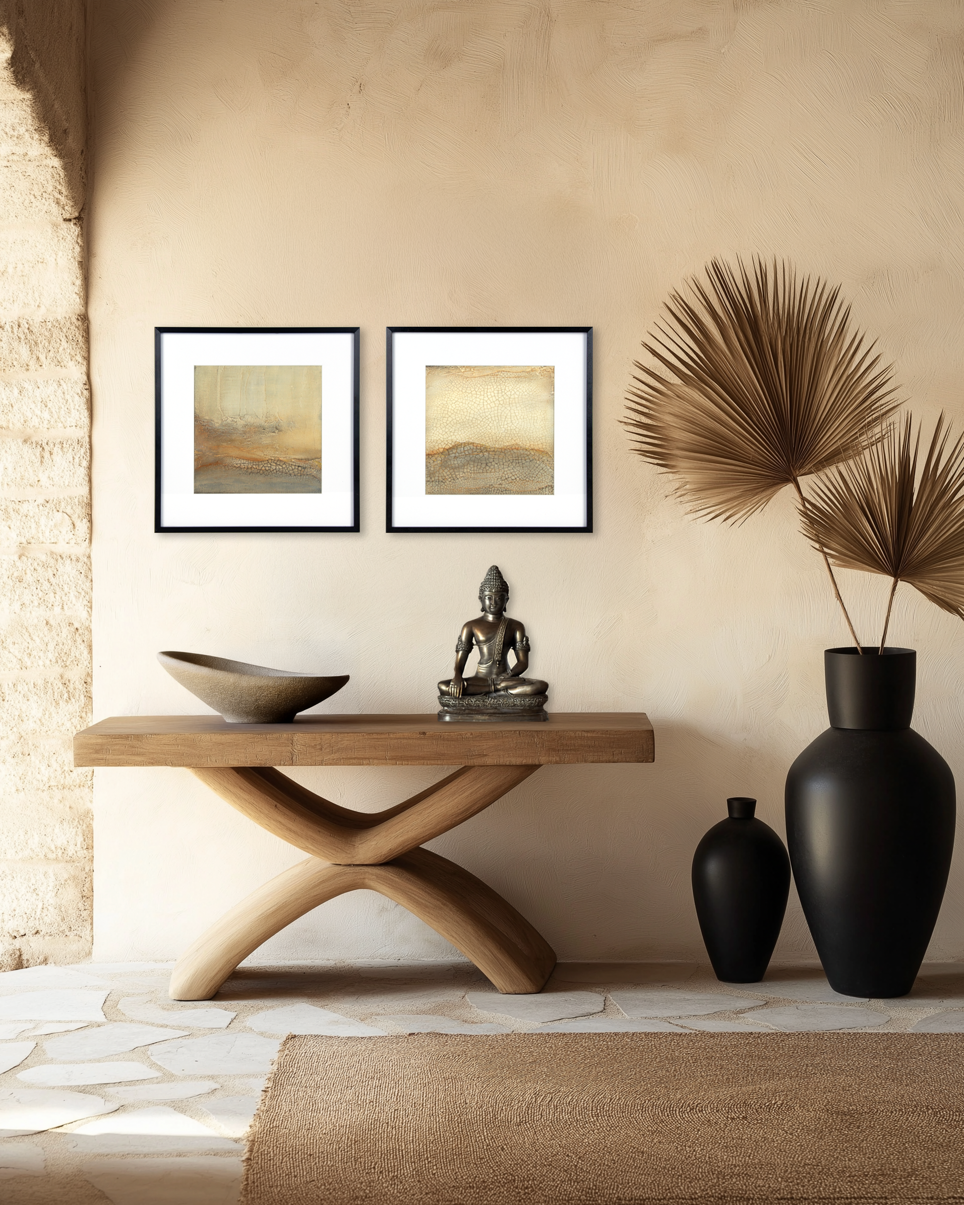 Inspired by the quiet elegance of Australian sandy shores, this minimal pair explores the subtle textures and tones found in coastal stones and sun-washed rocks. Soft hues of beige and grey form a muted palette that mirrors nature’s restraint. The surfaces hold a tactile stillness, inviting the viewer to experience the calm, grounded rhythm of the natural world.